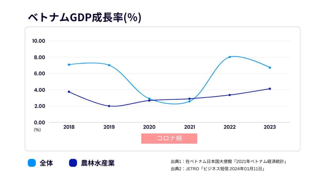 工業・サービス業のGDPの伸びが顕著ななかでも、農林水産業のGDP成長率が2%以上を確保しているという状況は、ベトナムでの農林水産業の重要性が高いことを示しています。